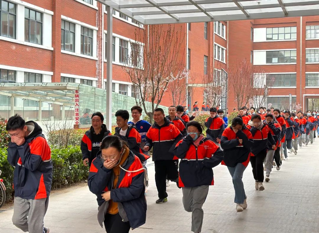 演练中,随着警报声响起,班主任老师组织全体同学弯着腰,靠着墙,捂住口鼻,按照预定路线迅速撤离至安全地带。整个演练过程组织有序,分工明确,效果良好。
