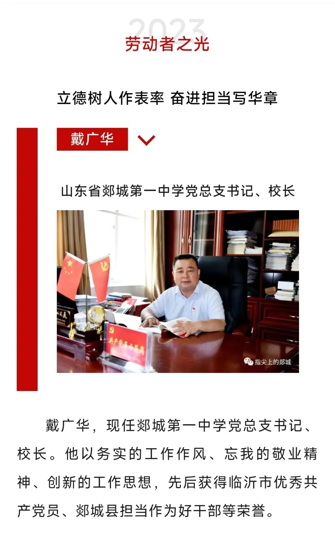 【劳动者之光】2023年劳模事迹展 县级劳动模范——戴广华山东省郯城第一中学2年前发布关注私信06711 (2023年第44期/总第570期) 2023 (来源:指尖上的郯城) THE END学校新闻 点赞11 分享QQ空间微博QQ好友海报分享复制链接收藏