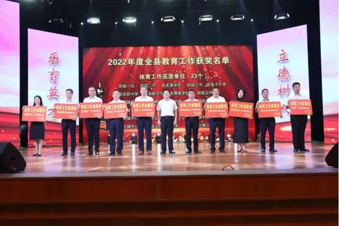 郯城一中在表彰大会上荣获“2022县教书育人先进单位”、“2022县师德建设工作先进单位”、“2022县体育工作先进单位”、“2022县教学成果优秀奖”、“2022县群众满意学校”等荣誉称号。 丁启飞老师荣获“最美教师”称号。刘伟等4名老师荣获“优秀教育工作者”称号。吴卫华等6名老师荣获“师德标兵”称号。孙泉城等14名老师荣获“优秀班主任”称号。朱强等37名老师荣获优秀教师称号,优秀教师代表孟祥功老师作了精彩的事迹报告。