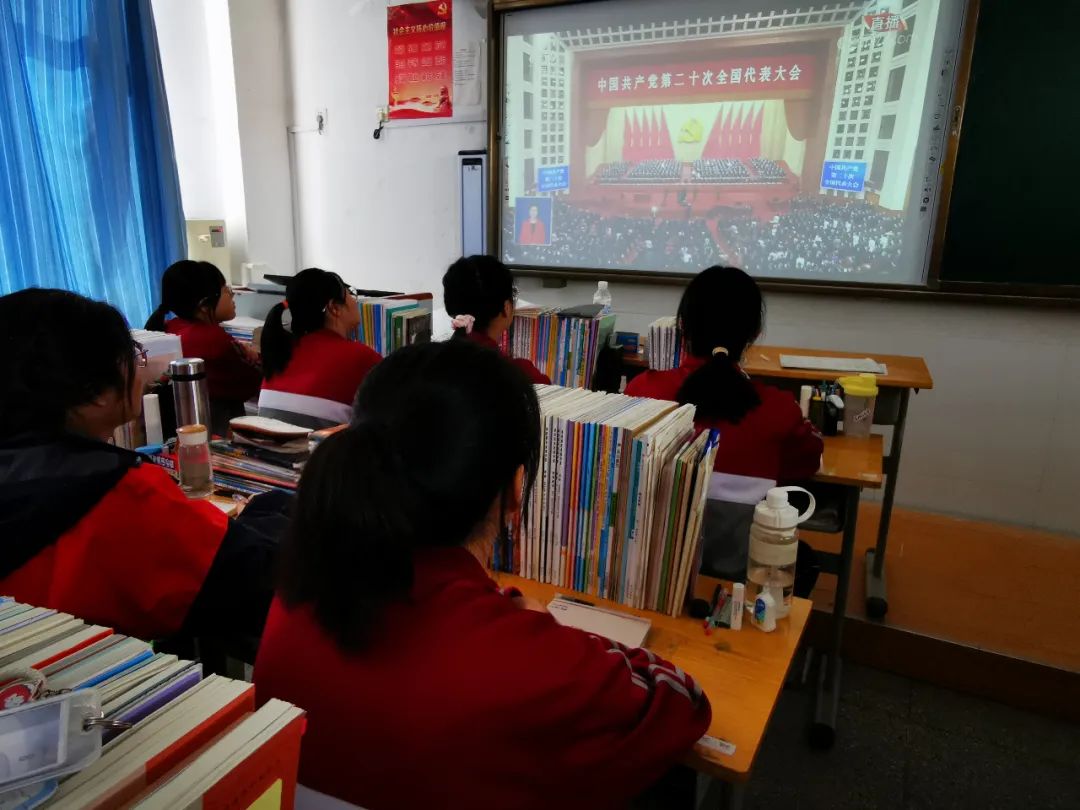 学校党总支书记、校长戴广华,党总支委员、副校长谭常富、张中文,工会主席陆兰江,教导处主任王玉飞,办公室主任王军峰等封闭在校内的党总支委员一起收听收看。各党支部、各处室、级部科学安排党员、师生在严格落实疫情防控要求基础上,自行收听收看大会盛况。各班主任、思政课教师带领在校学生在各班级教室内收听收看,通知居家学习学生在家收听收看。